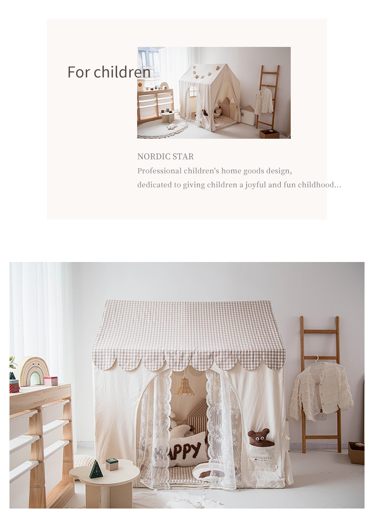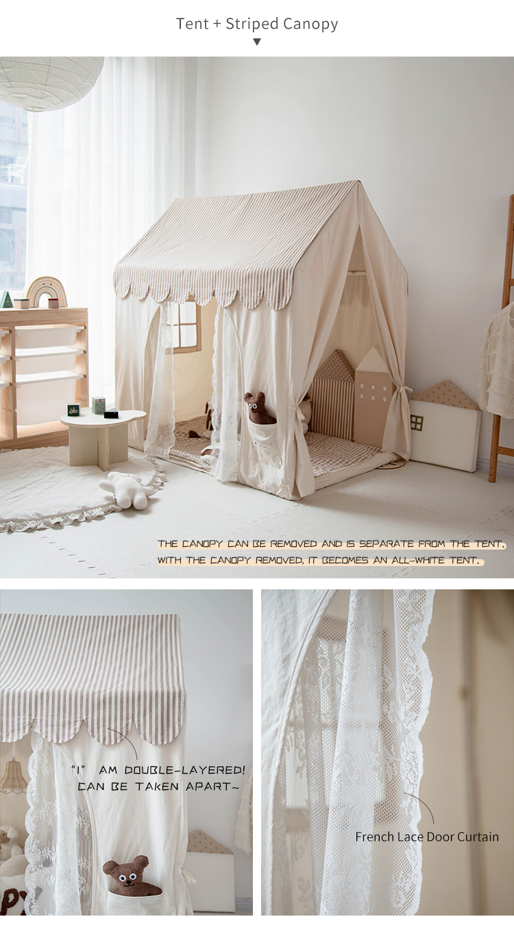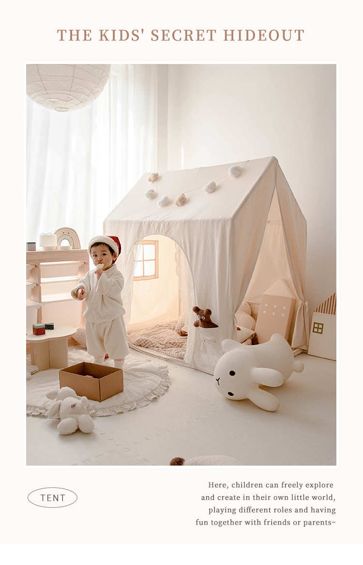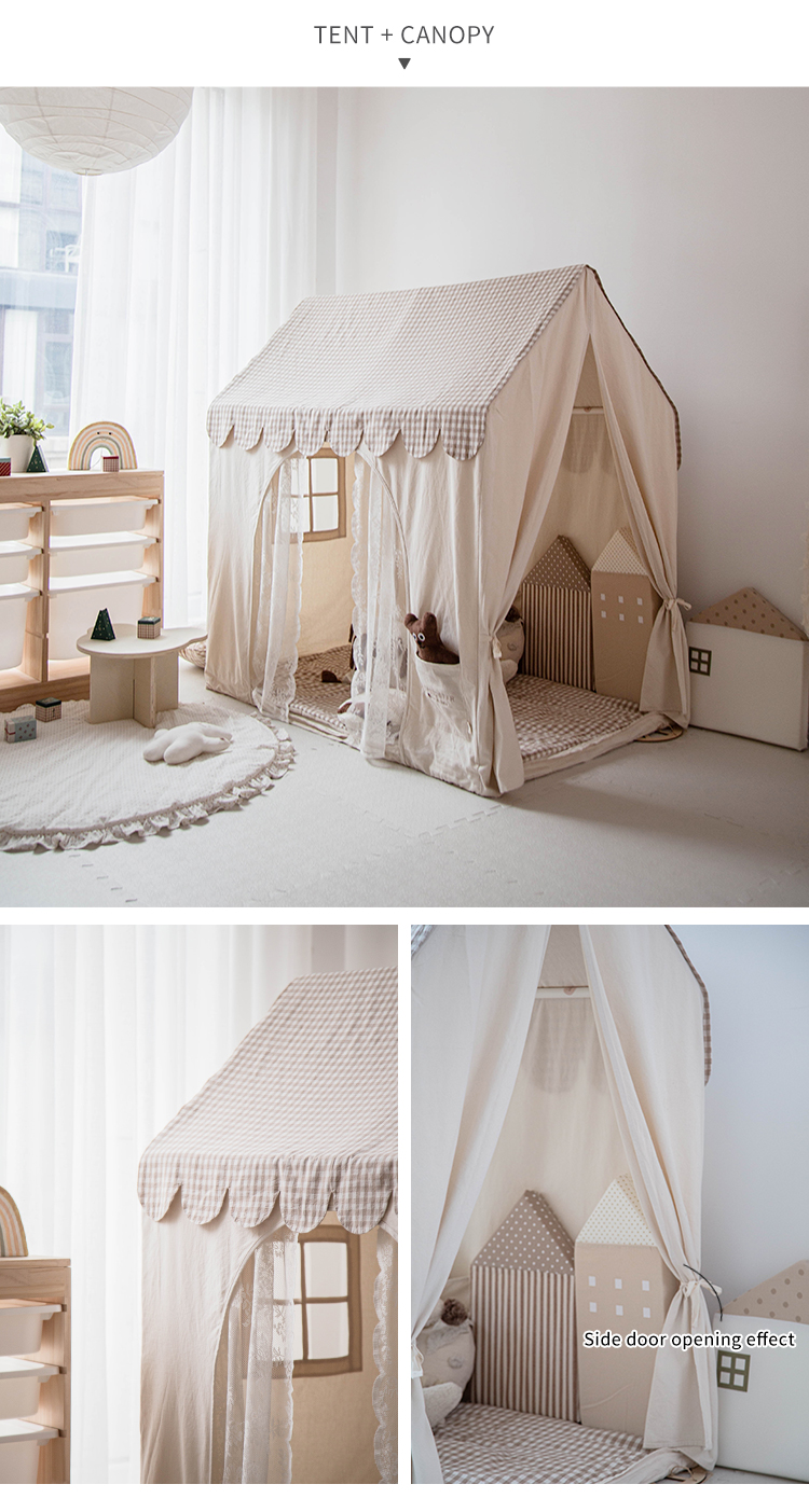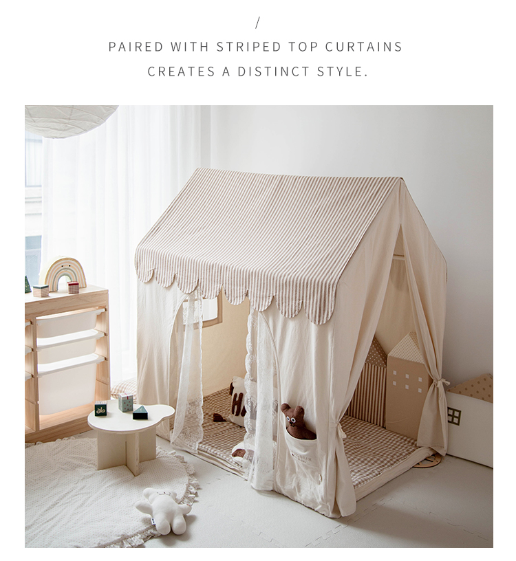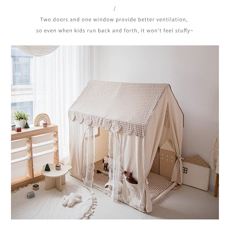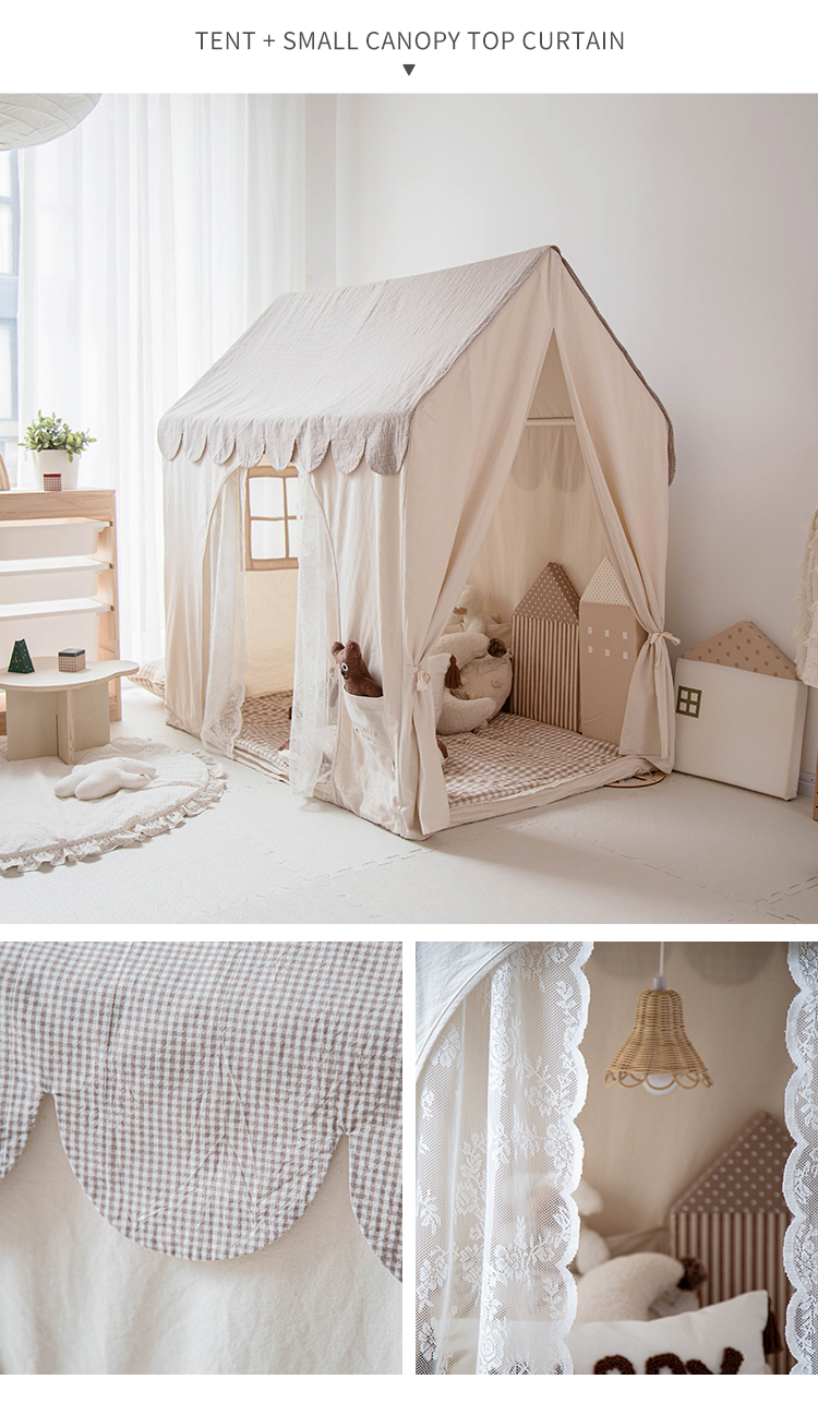 In residential contexts, this kids play tent house serves as both a recreational and partitioning solution for families requiring dedicated play zones within limited living spaces. The tent’s breathable, cotton canvas material supports indoor air quality while preventing heat retention common in enclosed fabric structures. Easily incorporated within home furnishings, this design can be combined with other indoor playroom elements to optimize space functionality and child safety. For wholesale tent distributors and custom tent manufacturers, this product demonstrates a balance between aesthetic appeal and practical usability, offering a value proposition optimized for diverse household environments.