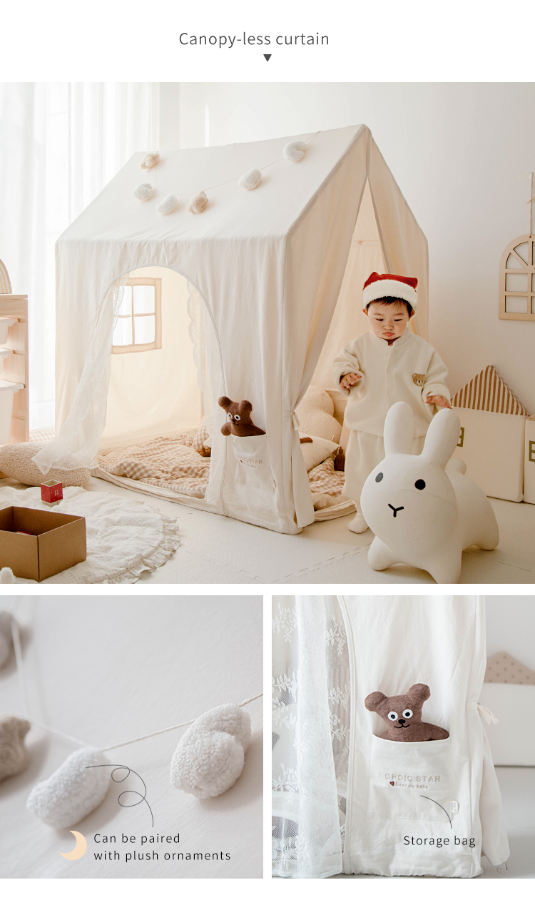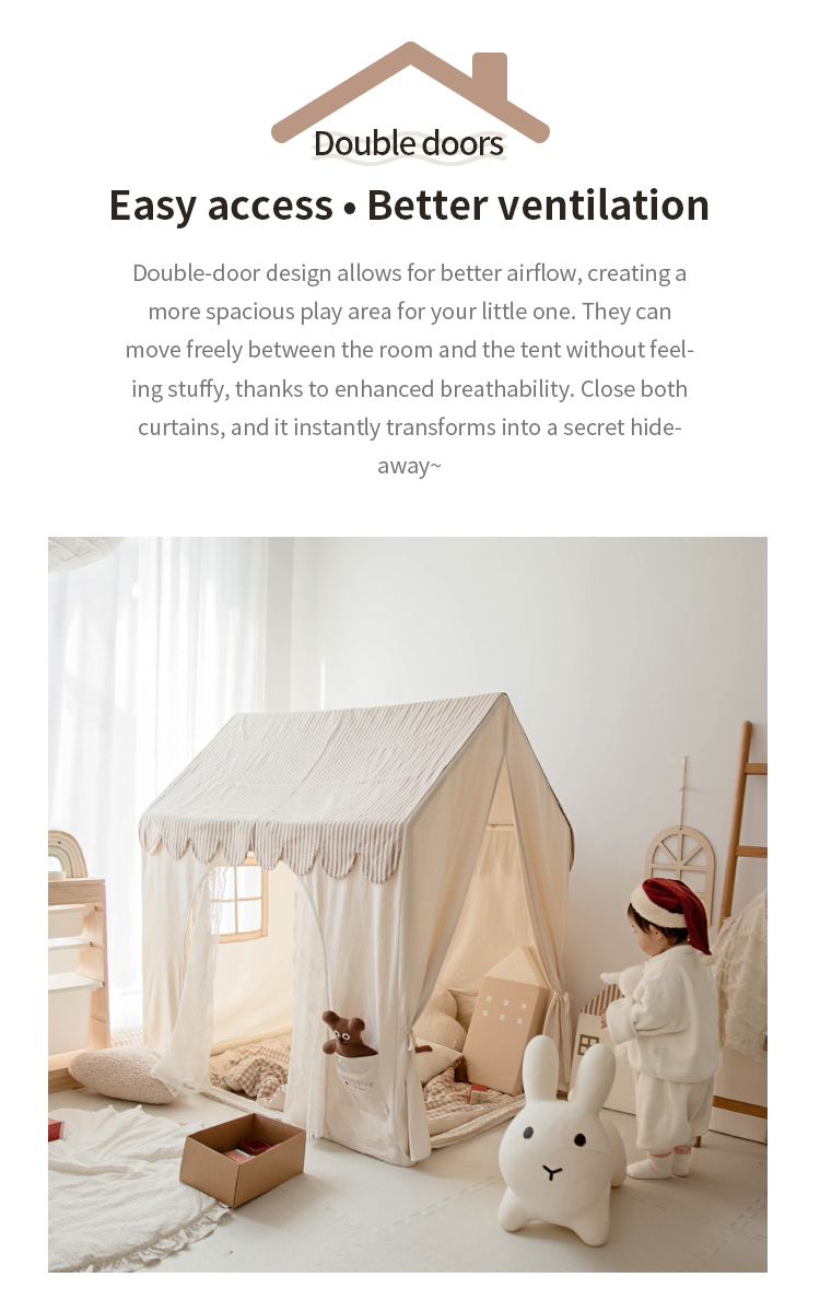 Double-door design allows for better air circulation, creating a more spacious play area for your little one. They can move freely between the room and tent without feeling stuffy. The pure cotton fabric cover offers enhanced breathability. Close both curtains to instantly transform it into a private hideaway.