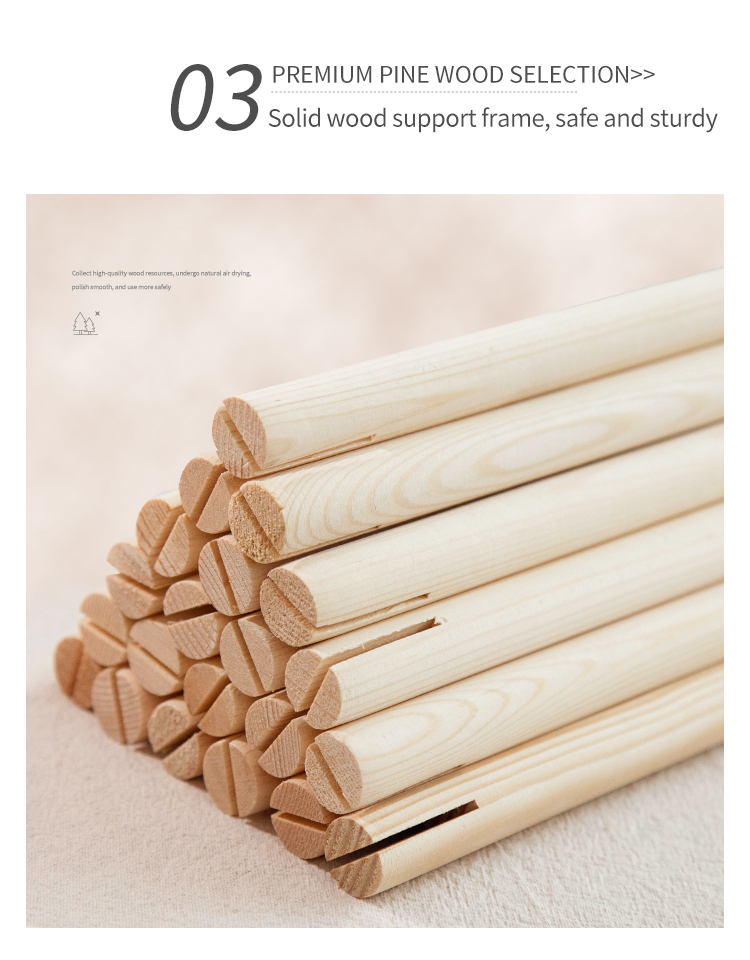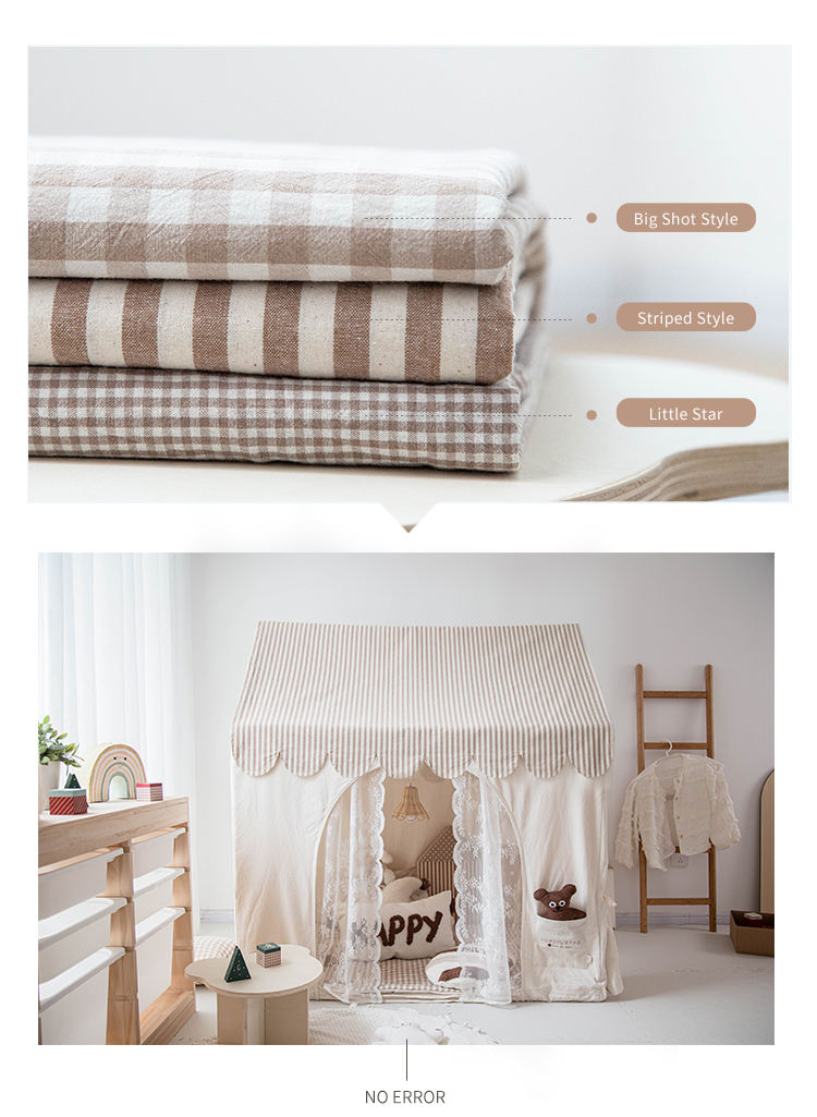 Our kids play tent house is made from 100% cotton canvas for breathability and comfort. The frame combines solid wood and PVC for stability, while the floor mat uses cotton, cotton canvas, and PP cotton to provide a soft and durable play surface.