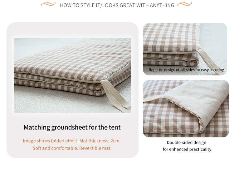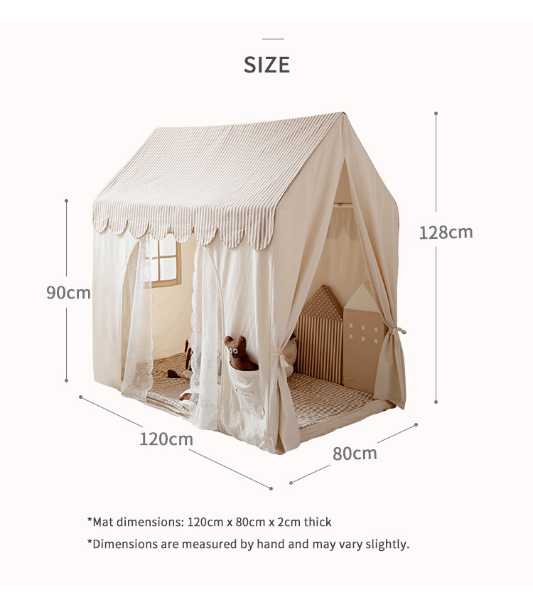 | skm-26 | tent | Light beige | 128cm Length 120cm × Width 80cm × Height 128cm | 100% cotton canvas | Single tent: 3.5 kg | Cold water wash; suitable for hand washing or machine washing. The floor mat can be hand washed. |
